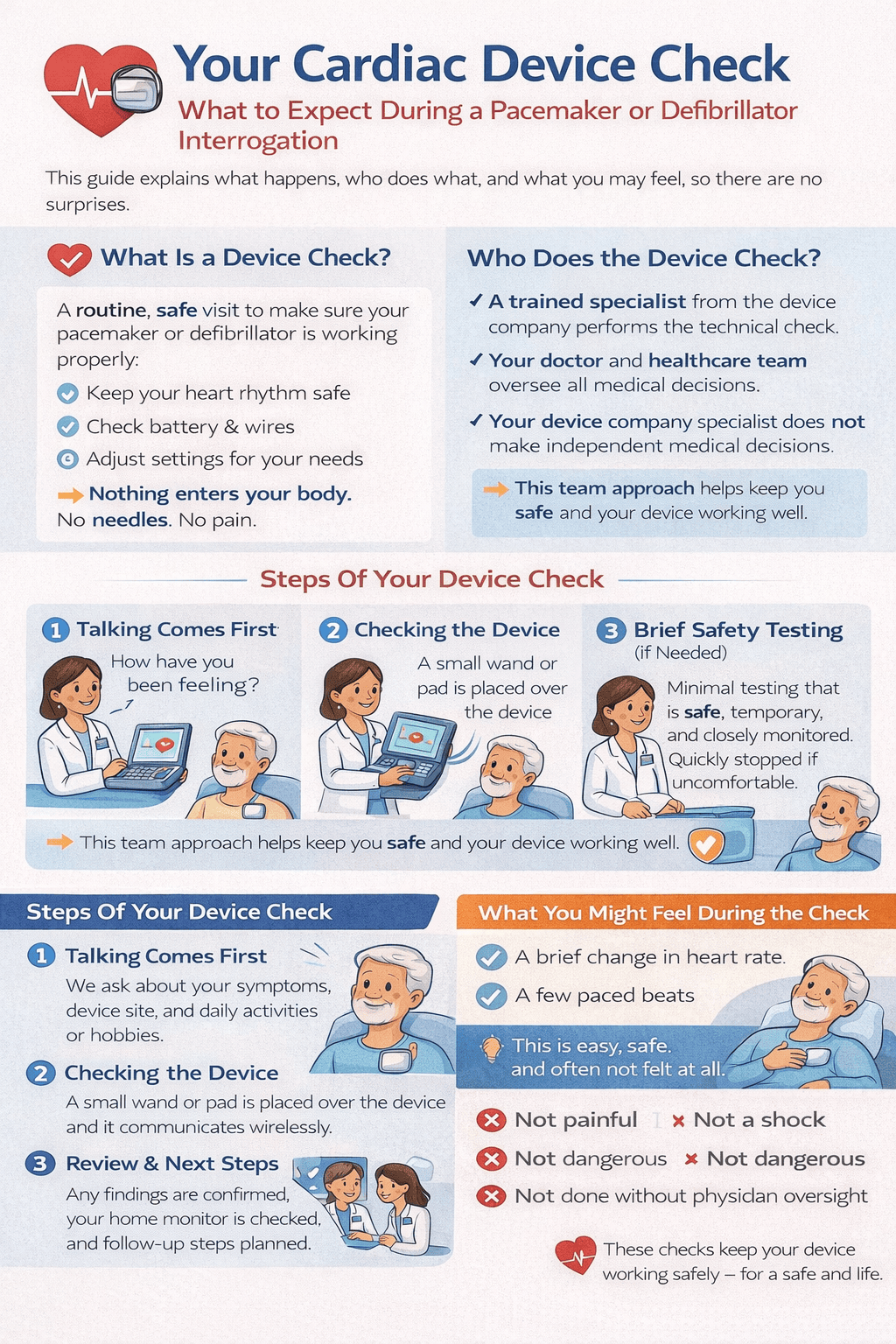 This patient-facing educational handout explains what a cardiac device interrogation involves in clear, nontechnical language. Patients frequently experience anxiety, confusion, or uncertainty when informed that their pacemaker or defibrillator will be checked, particularly during inpatient rounds or clinic visits. This resource provides a simple, step-by-step overview of what to expect, clarifies the roles of the device company specialist and clinical care team, and reduces reliance on medical jargon to support patient understanding, reassurance, and engagement in device management care.